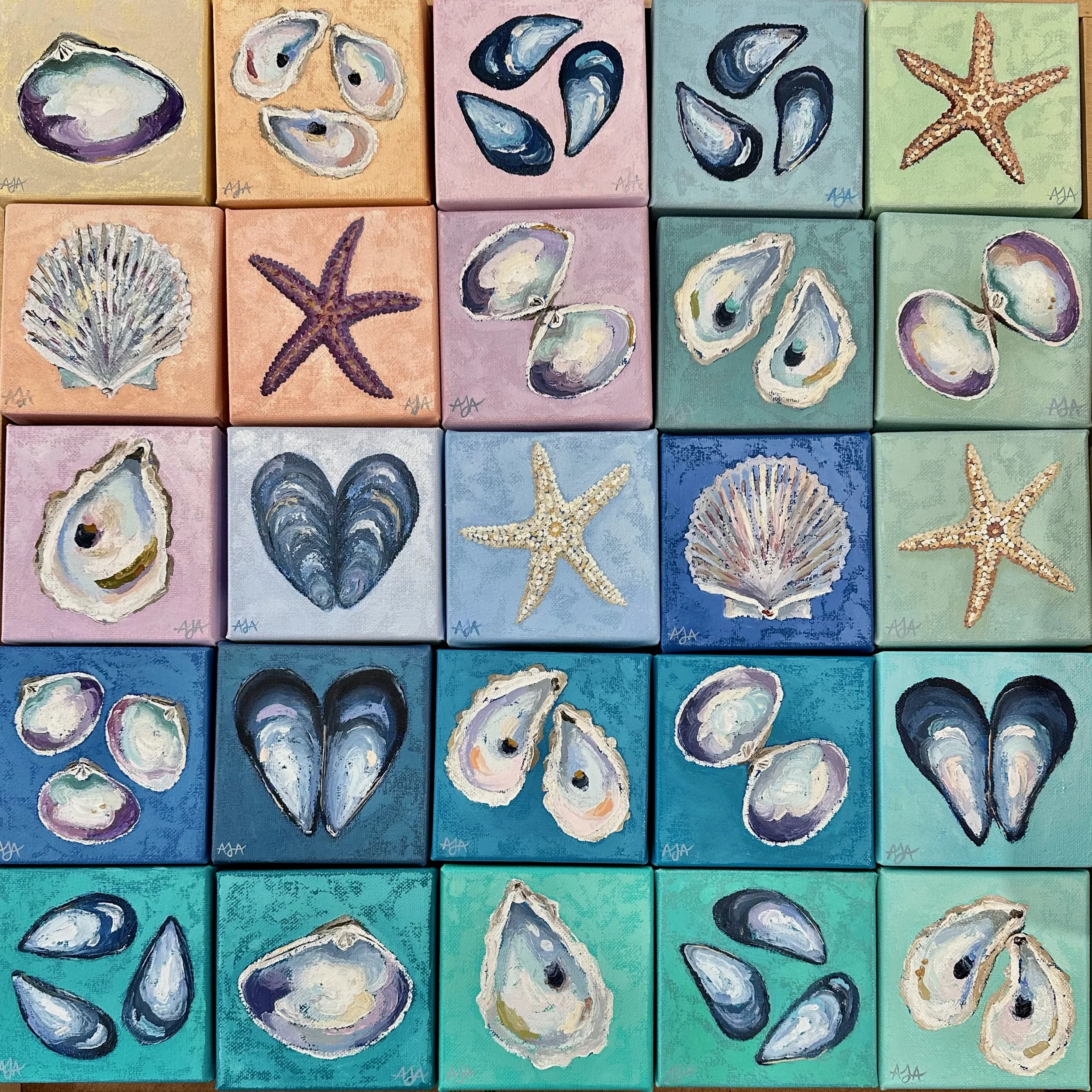 All oil paintings are on canvas and original artwork. I first start by painting the canvas a bold base color. Then I add the shell and tonal background on top. The sides of the deep canvas are left open and I intentionally leave spots where the base color comes through, creating an additional layer of depth. I love to explore and exaggerate color and texture to make each shell unique!